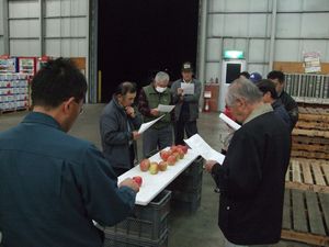 のりんごの色合いや傷等の具合を生産者の間で話し合いが行われました。
